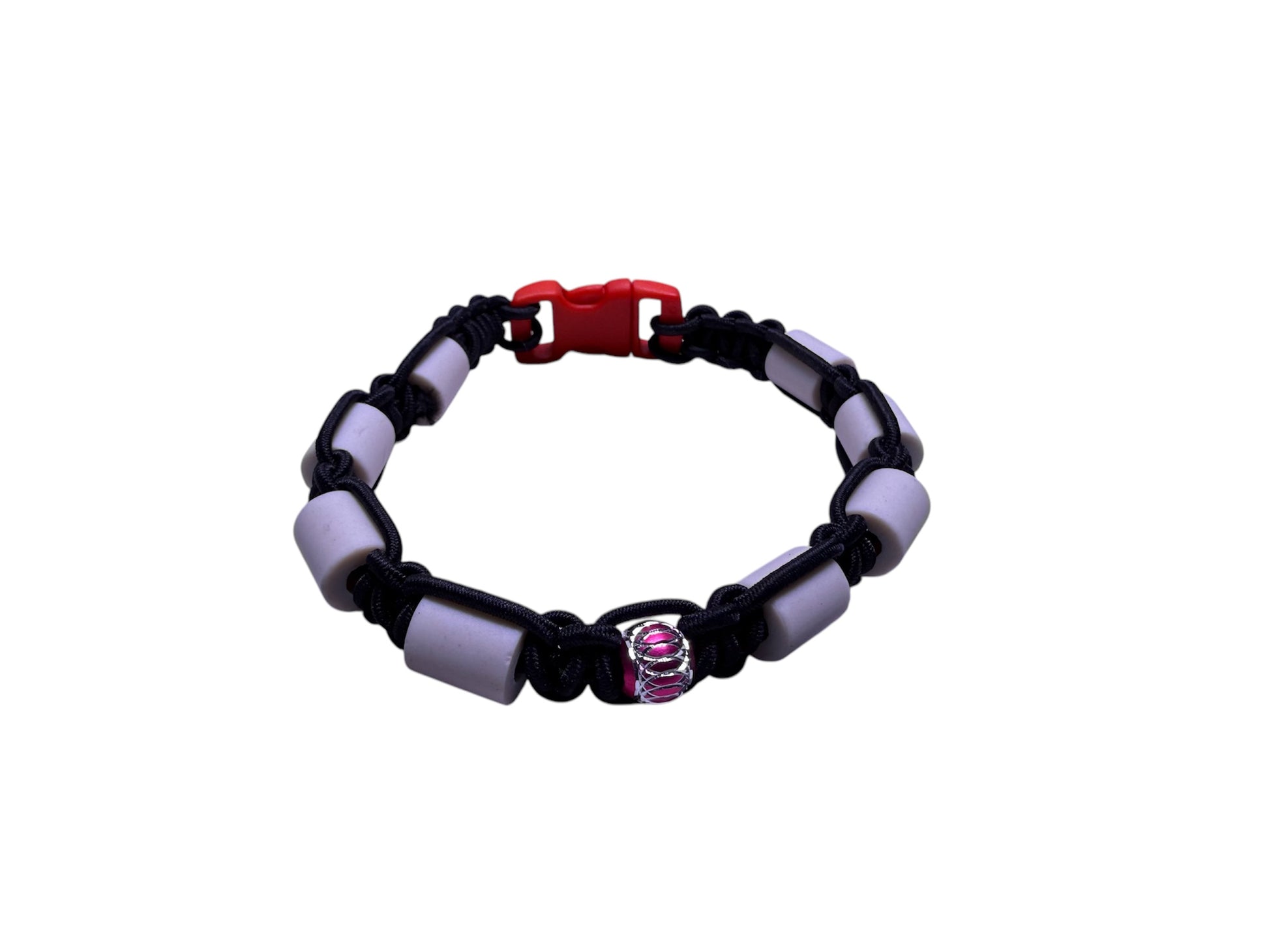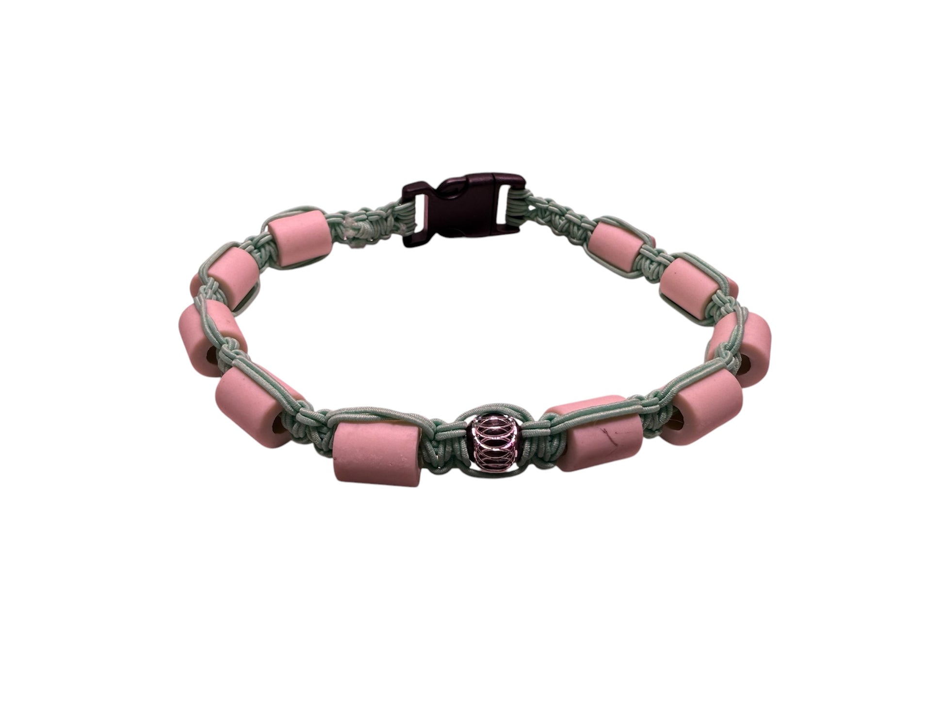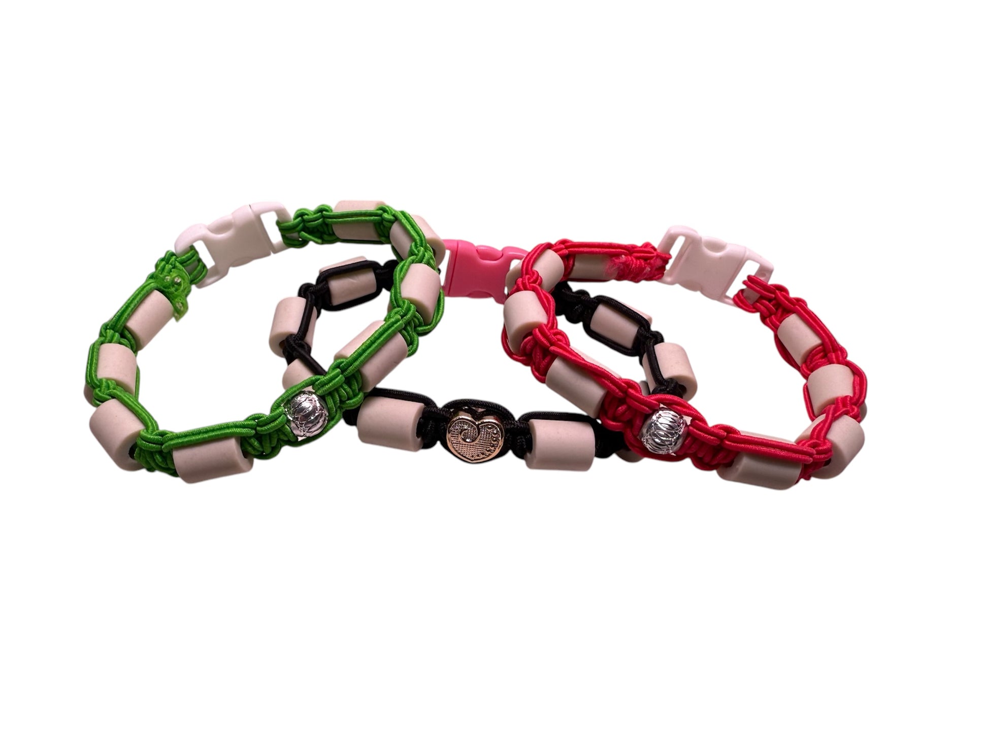 Flätade halsband med elastiska rep ca 2 mm och keramikrör som verkar avskräckande mot fästingar.