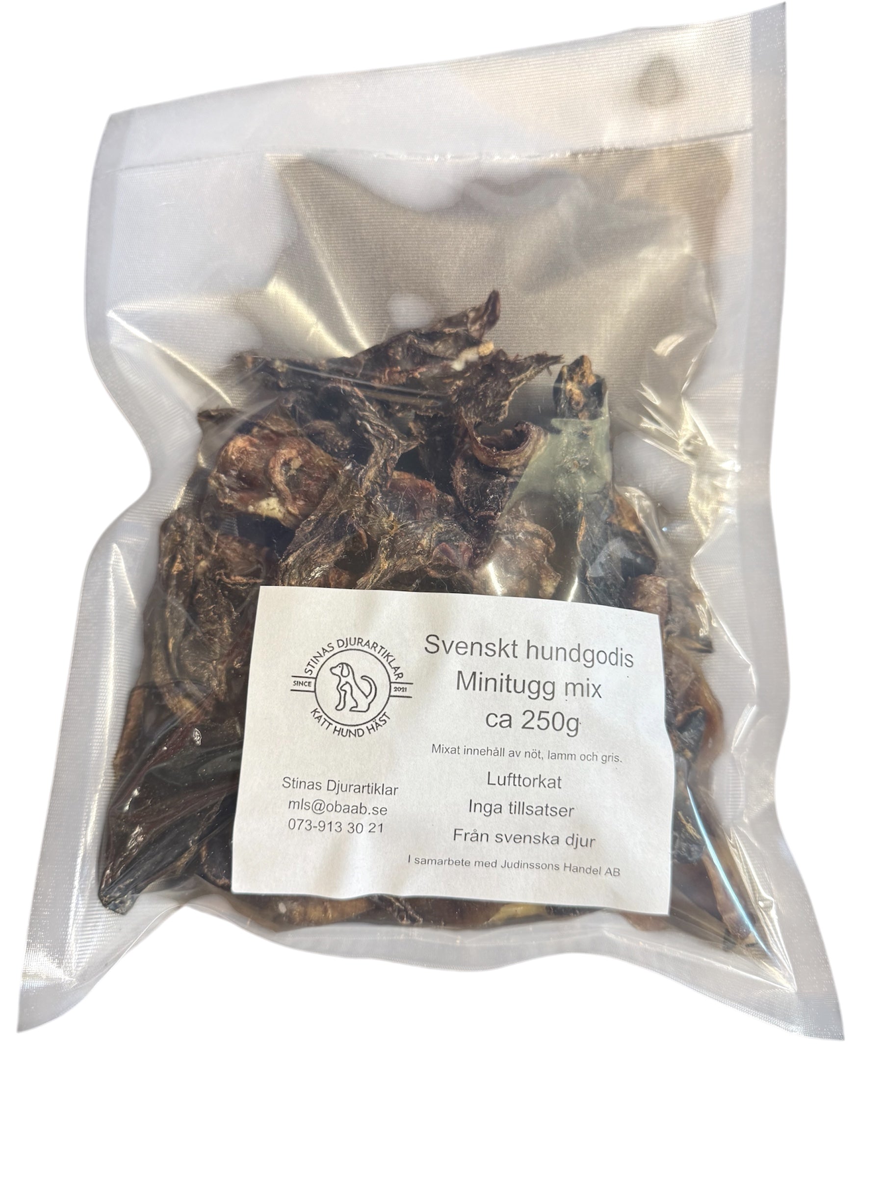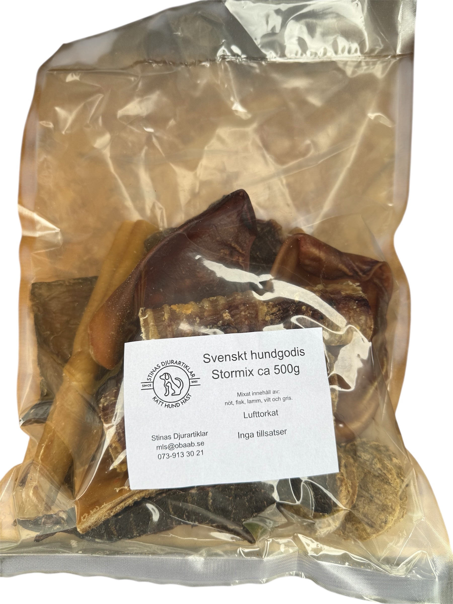 Vi har även en mixad påse lämplig för större hundar och en minimix som passar mindre hundar. Minimixen kan ha olika storlekar på bitarna. Skriv i beställningen om du vill ha extra små bitar.