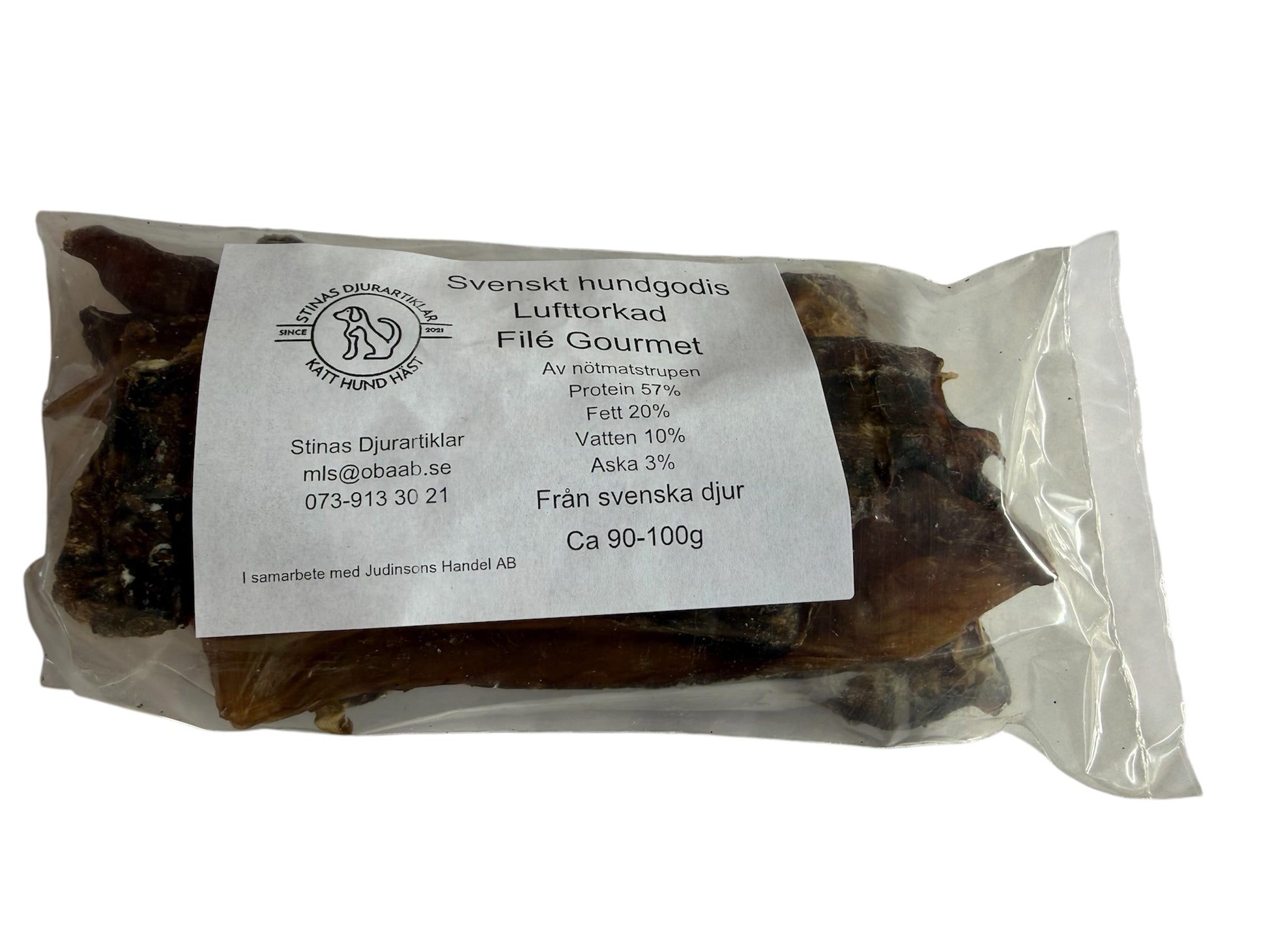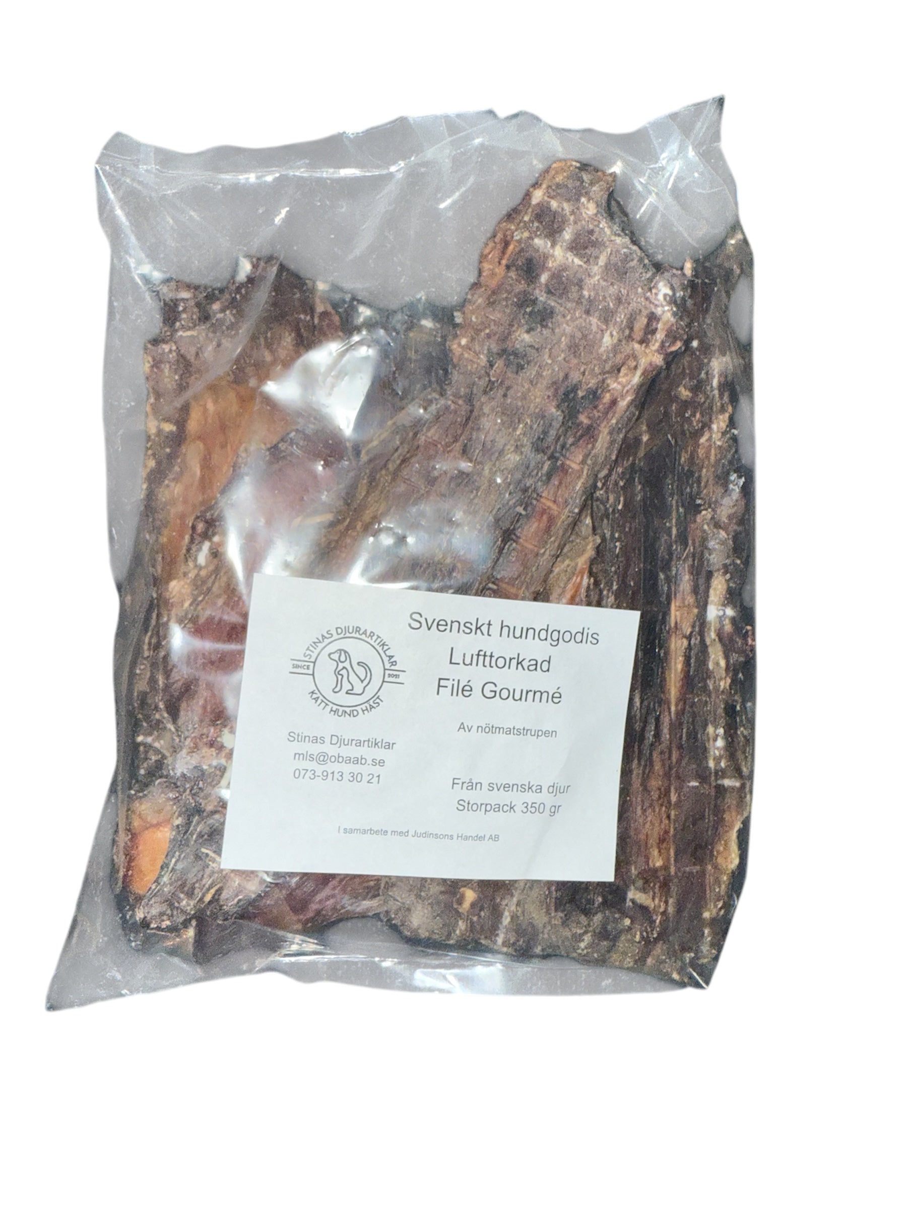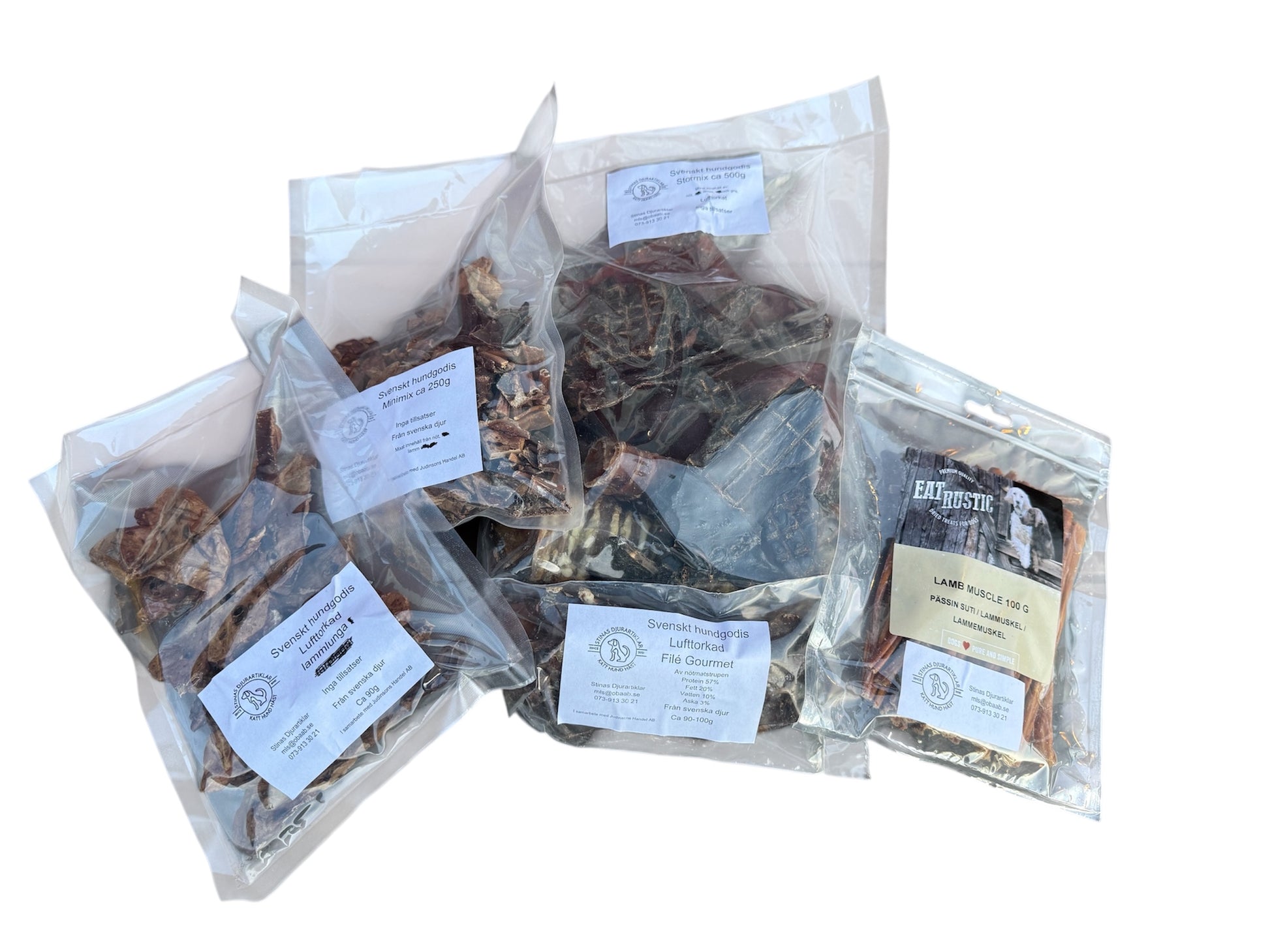 Våra specialiteter inkluderar lufttorkade delikatesser som lammlunga, lammlever, nöthjärta, miniknorr, grisöron, tuggrullar, älgchips, oxstrupe, oxlever, Filé Gourmé, lammuskel.